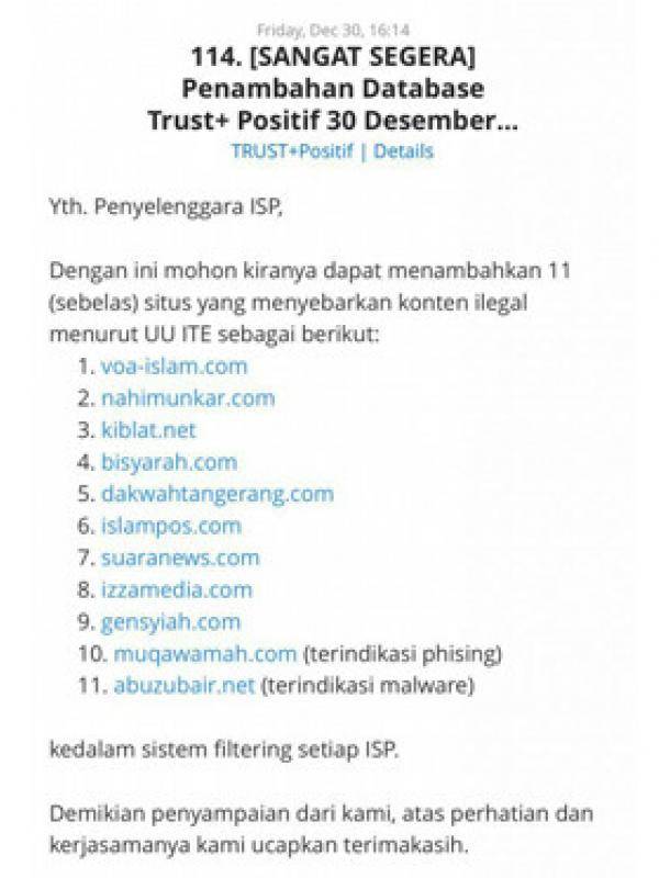 Berdasarkan tangkapan layar dan informasi yang beredar di Twitter dan Facebook, sebelas situs web yang dimaksud adalah voa-islam.com; nahimunkar.com; kiblat.net; bisyarah.com; dakwahtangerang.com; islampos.com; suaranews.com; izzamedia.com; gensyiah.com; muqawamah.com (terindikasi phising); dan abuzubair.net (terindikasi malware).